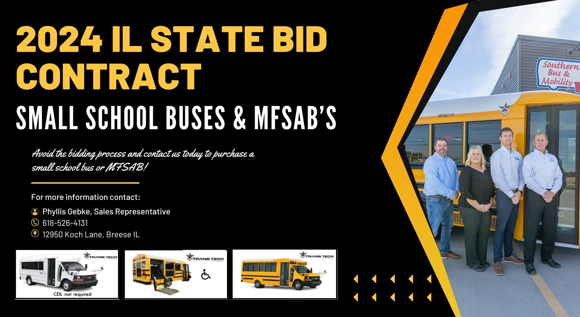 Southern Bus & Mobility is a dealer for wheelchair accessible vehicles in St Louis. This includes wheelchair accessible vans, wheelchair lifts, commercial shuttle buses and vans, and mobility equipment. We also specialize in small and midsize school buses, multi-function school activity buses, and offer a full service garage for all of your post sale needs.