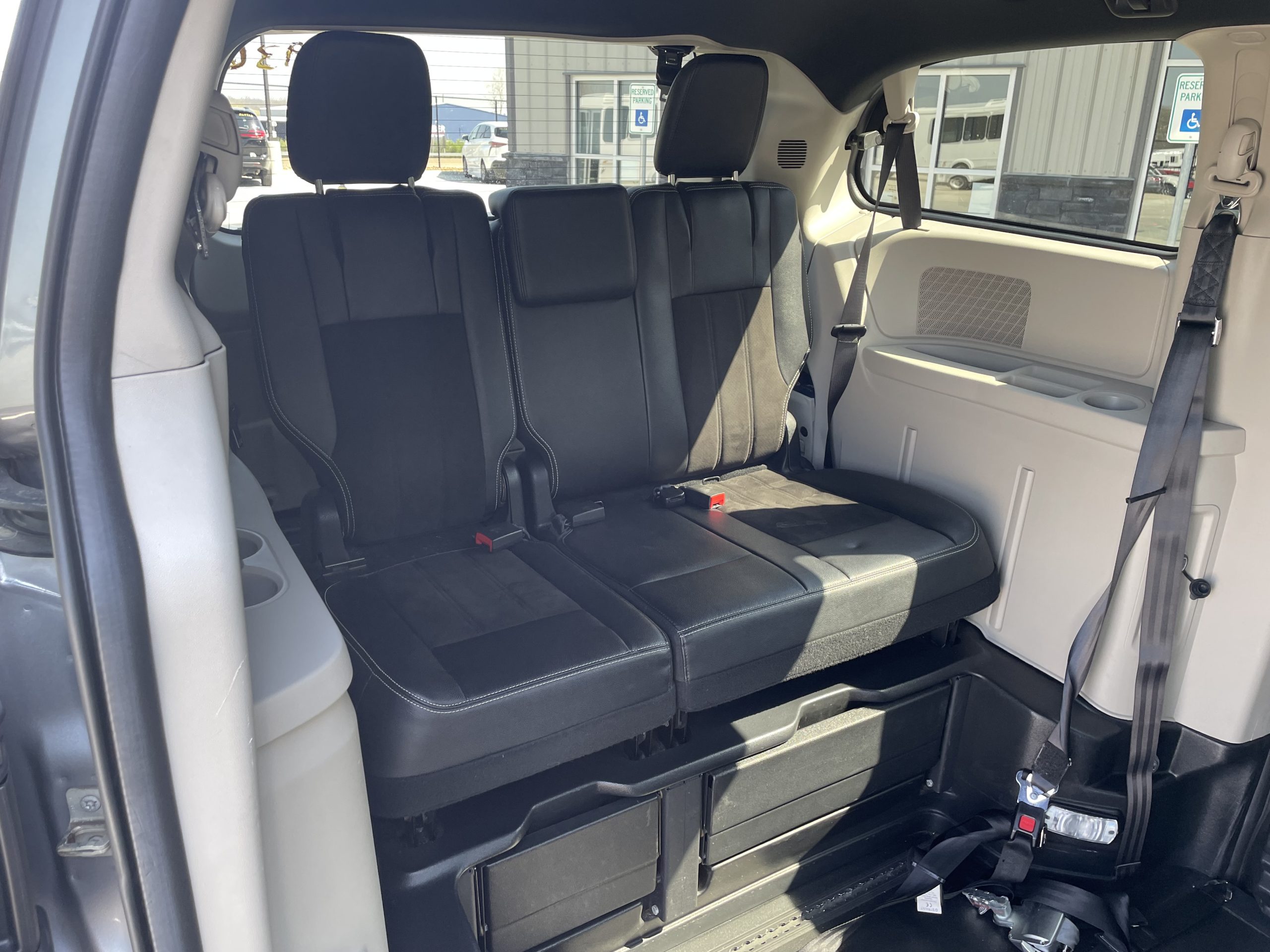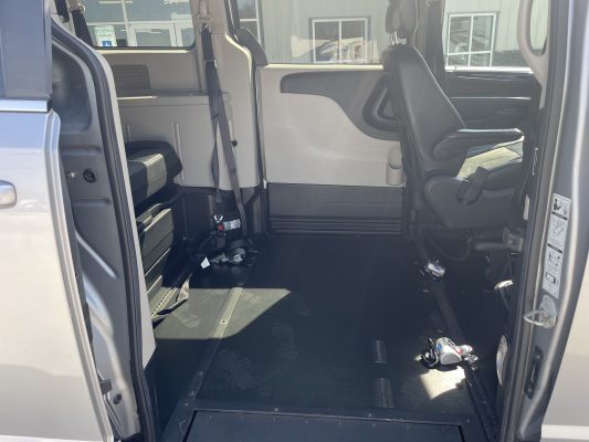 3/8” marine grade plywood sub-floor; Altro commercial flooring; 14” Lowered floor (62 ½” wide x 86” long) from firewall to rear axle providing 61” headroom (floor to ceiling) in center of van; Manual infloor ramp providing 30” usable width x 52” long; Manual driver and passenger side sliding doors, with 56¼”vertical opening and 31½” wide opening on passenger side; Quick-release driver and front passenger seats with a wheelchair securement position on passenger side with 60” headroom from floor to ceiling; Multiple wheelchair tiedown locations with one Q’Straint QRT belt securement system; ADA ramp and door entrance lighting; Emergency rear hatch release; Flip down footrests for 3rd row seating; 1,000-pound ramp capacity.