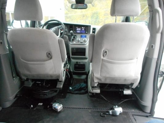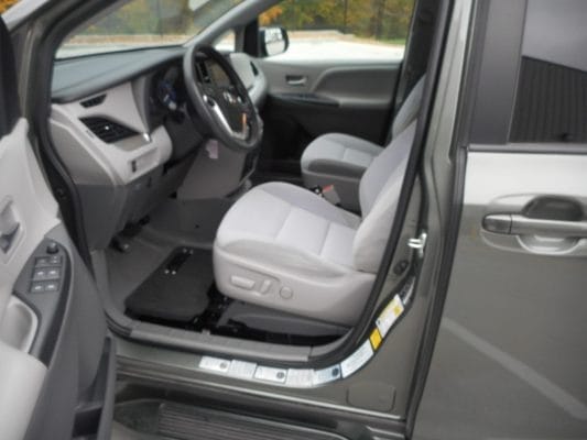 Remote keyless entry system with two transmitters (OEM supplied) for: power passenger sliding door, kneeling system and power infloor ramp; (4) interior switches to operate accessible features; 12” lowered floor from rear axle to firewall, 83” in length and 59” wide at B pillars; 57” floor-to-ceiling height in the center of the van & 55 ½” in driver and front passenger positions; Power passenger side sliding door with manual release feature providing 54 ¼” clear vertical passage way; Power infloor ramp (30¼” wide x 52” long) with manual backup; One wheelchair restraint belt system; Wheelchair tracking in co-pilot position in addition to center of van; Easy-out driver and front passenger seats; Electronic, mechanical kneeling rear suspension; On/off kneeling switch; Commercial rubber flooring in lowered floor area; Remounted spare tire behind 3rd row bench seat in storage department below floor; 4 Q’Straint retractable tiedown belts.; B&D transfer Seat driver side