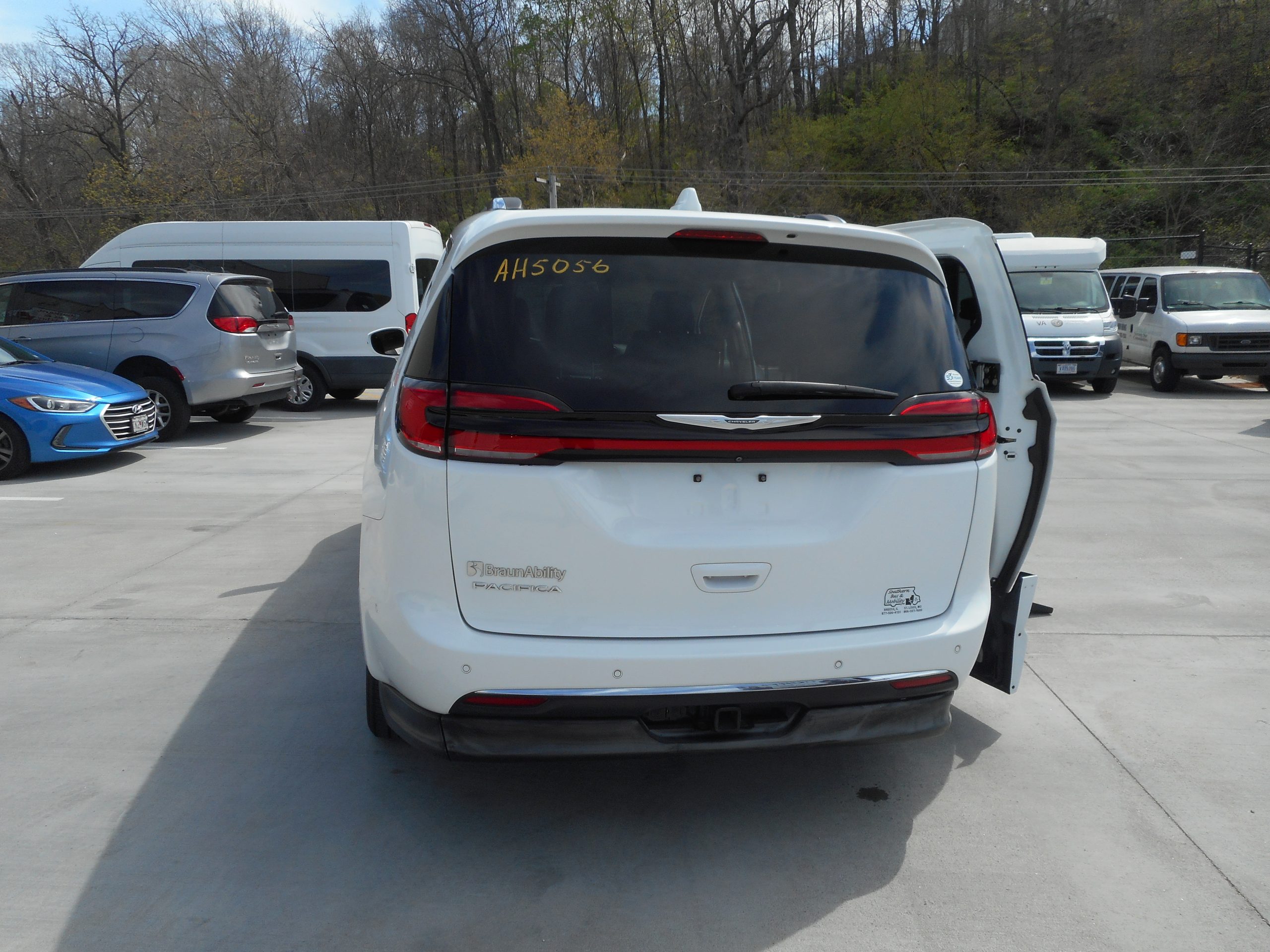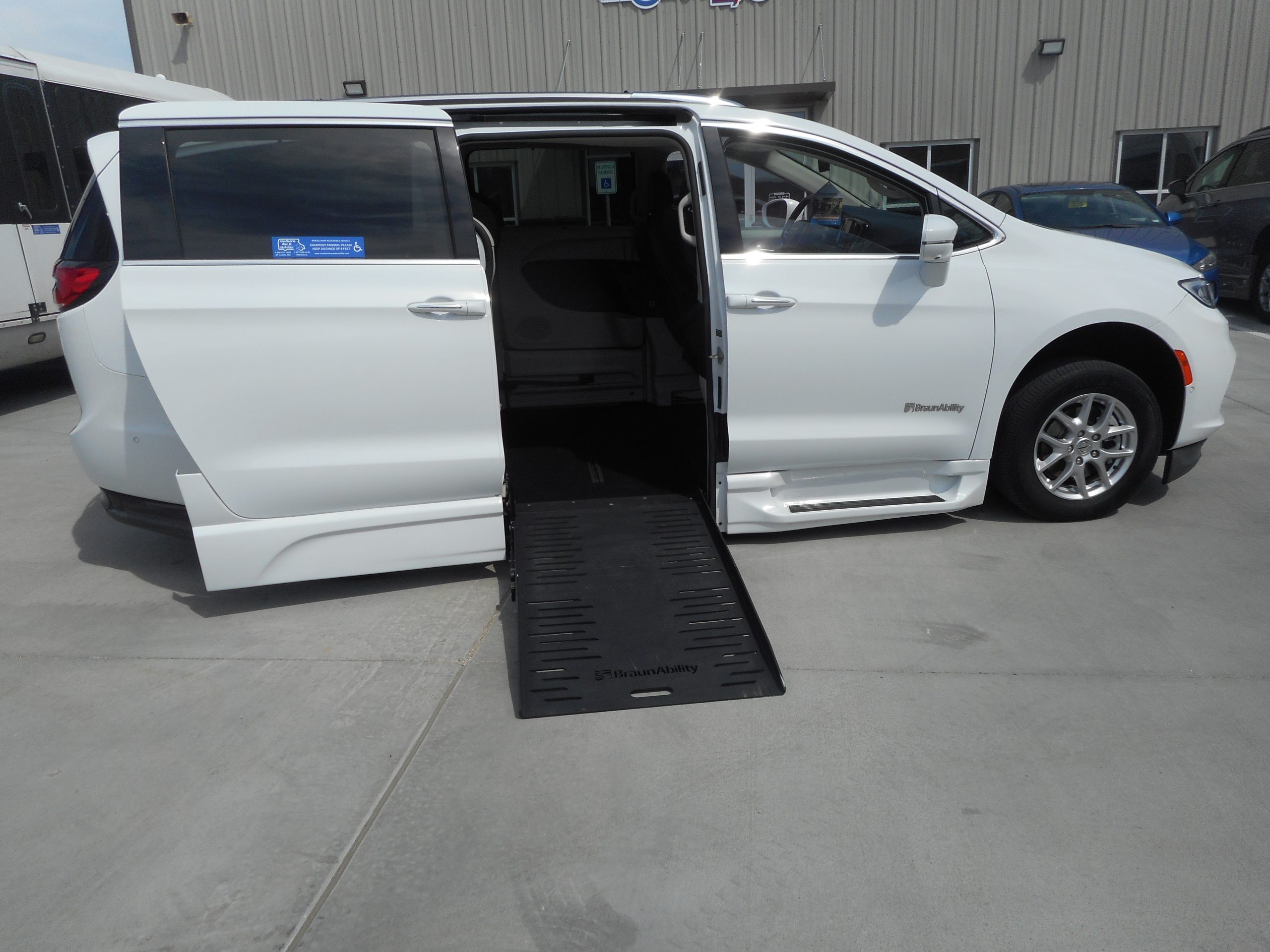 Remote keyless entry system with two transmitters (OEM supplied) for: power passenger sliding door, kneeling system and power folding ramp; (4) interior switches to operate accessible features; 14” lowered floor from rear axle to firewall, 98½” in length and 64” wide at center of floor; 60” floor-to-ceiling height in the center of the van and 60” in driver and front passenger positions; Power passenger side sliding door with manual release feature providing 56.5” clear vertical passage way; Power aluminum non-skid ramp (30 1/8” wide x 52” long); 32 3/8” ramp door opening; Integrated step at driver and passenger doors; Wheelchair tracking in co-pilot position in addition to center of van; Easy-out driver and front passenger seats; Electronic, mechanical kneeling rear suspension; On/off kneeling switch; Out-of-park kneeling override; Rubber flooring throughout lowered floor area; Q’Straint Retractable Tiedown belts; QLK Lock base in front, right position.