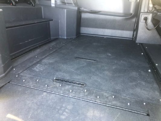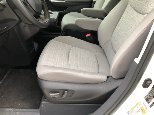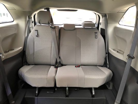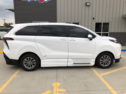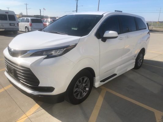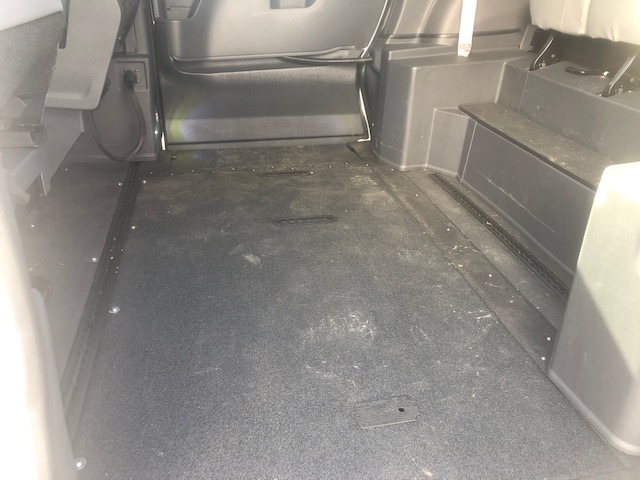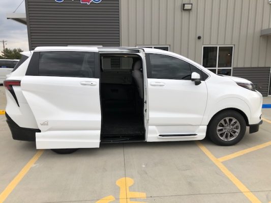 Remote keyless entry system with two transmitters (OEM supplied) for: power passenger sliding door, kneeling system and power infloor ramp; (4) interior switches to operate accessible features; 14” lowered floor from rear axle to firewall, 86” in length and 59.75”  wide at B pillars; 58.5” floor-to-ceiling height in the center of the van & 58.75” in driver and front passenger positions; Power passenger side sliding door with manual release feature providing 56” clear vertical passage way; Power infloor ramp (30” wide x 58.5” long) with manual backup; One wheelchair restraint belt system; Wheelchair tracking in co-pilot position in addition to center of van; Easy-out driver and front passenger seats; On/off kneeling switch; Commercial rubber flooring in lowered floor area; ParkSmart Alert, is the industry’s first integrated vehicle sensor designed to alert other drivers and individuals when they create an obstruction on right side of vehicle.
