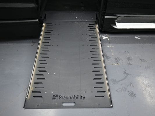 Remote keyless entry system with two transmitters (OEM supplied) for: power passenger sliding door, kneeling system and power infloor ramp; (4) interior switches to operate accessible features; 12” lowered floor from rear axle to firewall, 98” in length and 68” wide at center of floor; 58” floor-to-ceiling height in the center of the van and 58” in driver and front passenger positions; Power passenger side sliding door with manual release feature providing 55” clear vertical passage way; Power infloor ramp (32 ¼” wide x 52” long) with LED ramp lighting; 33” ramp door opening; Integrated step at driver and passenger doors; Wheelchair tracking in co-pilot position in addition to center of van; Q’Straint retractable tiedown belts; Easy-out driver and front passenger seats; Electronic, mechanical kneeling rear suspension; On/off kneeling switch; Out-of-park kneeling override; Commercial flooring throughout lowered floor area.