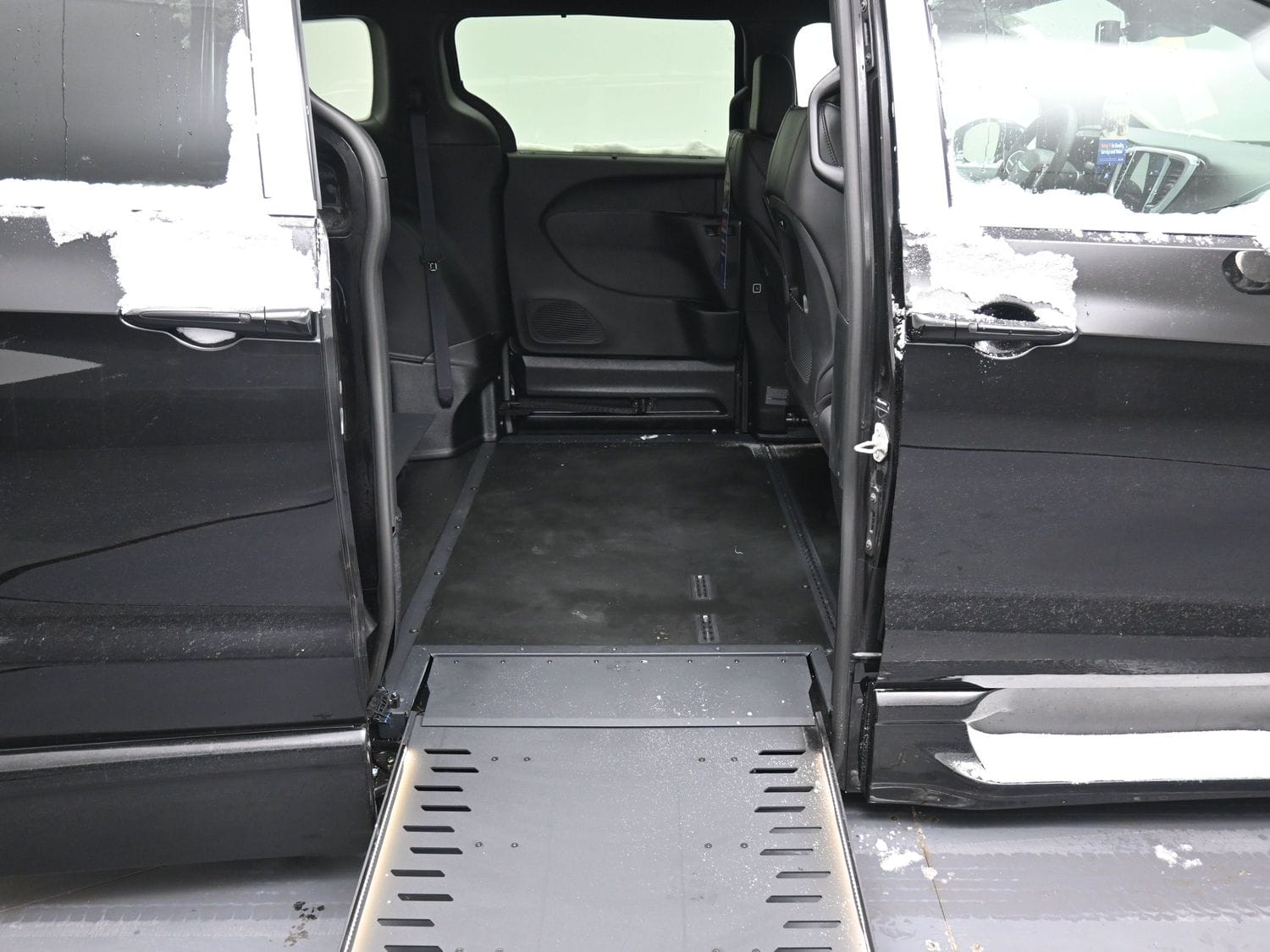 Remote keyless entry system with two transmitters (OEM supplied) for: power passenger sliding door, kneeling system and power infloor ramp; (4) interior switches to operate accessible features; 12” lowered floor from rear axle to firewall, 98” in length and 68” wide at center of floor; 58” floor-to-ceiling height in the center of the van and 58” in driver and front passenger positions; Power passenger side sliding door with manual release feature providing 55” clear vertical passage way; Power infloor ramp (32 ¼” wide x 52” long) with LED ramp lighting; 33” ramp door opening; Integrated step at driver and passenger doors; Wheelchair tracking in co-pilot position in addition to center of van; Q’Straint retractable tiedown belts; Easy-out driver and front passenger seats; Electronic, mechanical kneeling rear suspension; On/off kneeling switch; Out-of-park kneeling override; Commercial flooring throughout lowered floor area.