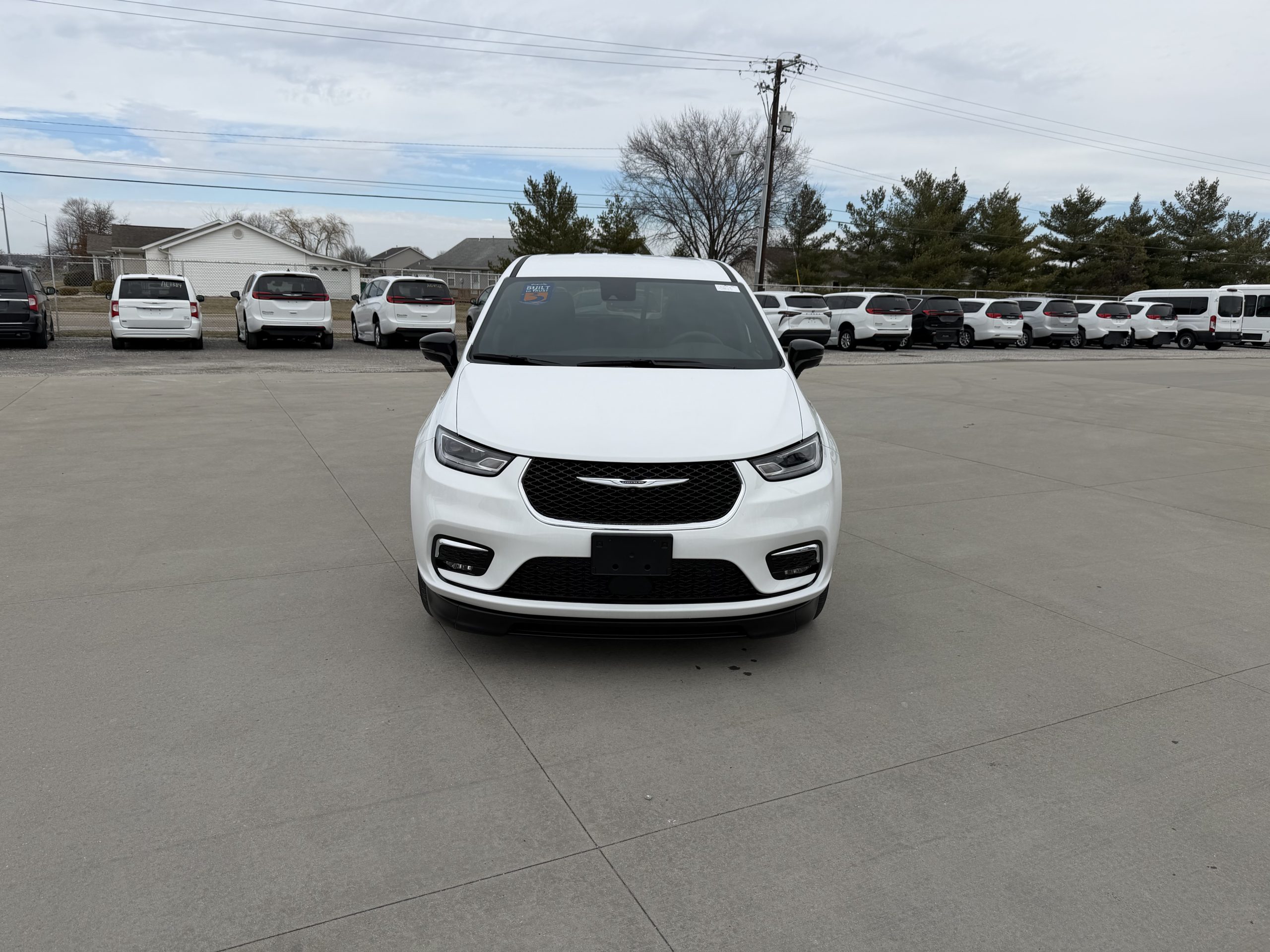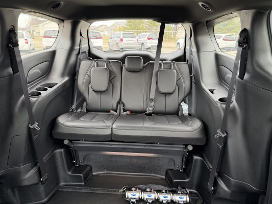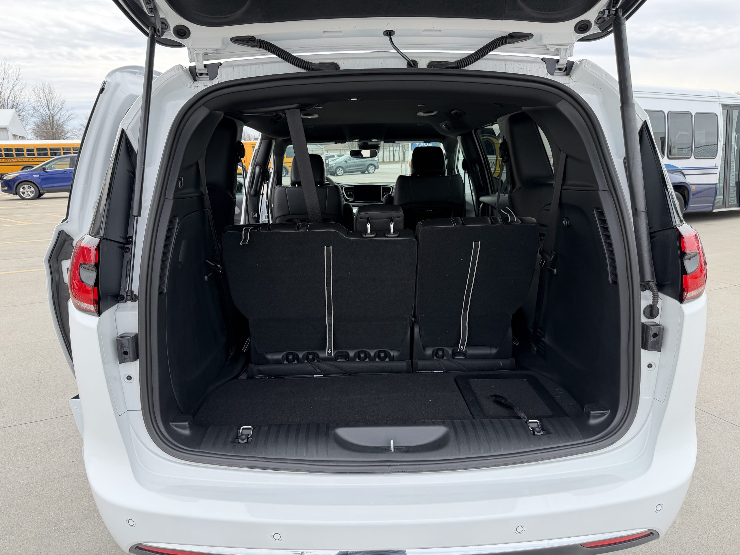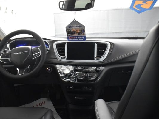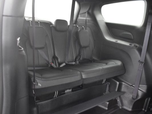 Front wheel drive; 3.6L V6 engine; 9-Speed automatic transmission; 121” wheelbase; 17” aluminum wheels; Tire Service Kit; Full instrumentation with tachometer; 4-wheel antilock braking system; Power windows; 2nd row power windows; Power door locks; Heated power remote mirrors; Fog lights; Tilt/telescoping steering wheel; Heated, Leather-wrapped steering wheel; Steering wheel-mounted audio controls; Remote Start; Push-button start; Remote keyless entry; AM-FM radio with USB & AUX inputs for digital media devices; ParkView rear backup camera; UConnect 5 with 10.1” display; Apple Carplay; Google Android Auto; Handsfree Phone & Audio; Sirius Satellite radio option; Front and rear air conditioning and heating, with 3-zone temperature control; Dual front air bags; Supplemental side-curtain air bags; Adaptive Cruise Control; Pedestrian Emergency Braking; Blind spot and rear cross path detection; Full Speed Forward Collision Warning Plus; Lane Departure Warning Plus; Rain sensitive intermittent wipers; Rear window defroster; Rear windshield wiper; Dual sun visors with illuminated mirrors; Reclining front bucket seats; Leather upholstery; 8-way power driver’s seat with memory feature; Heated front seats; 3-person rear bench seat; Driver and passenger side power sliding doors; Power liftgate; Tinted sunscreen glass; 2nd row window shades; Safety sphere package: 360 surround-view camera; ParkSense Front & Rear Park Assist with stop; Parallel and Perpendicular Park Assist with Stop.