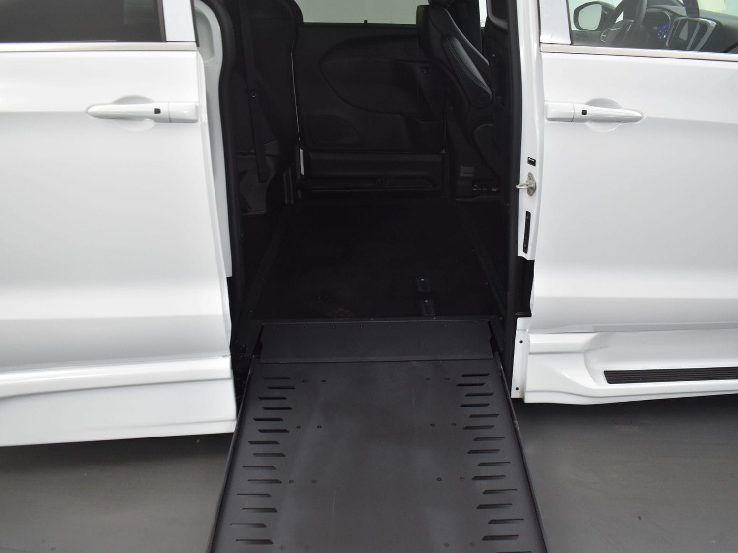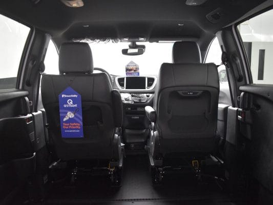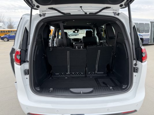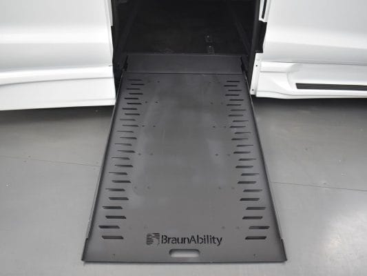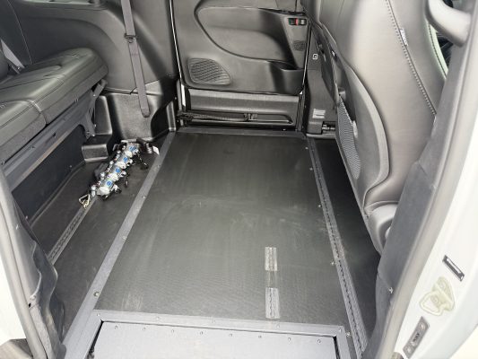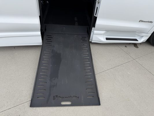 Remote keyless entry system with two transmitters (OEM supplied) for: power passenger sliding door, kneeling system and power infloor ramp; (4) interior switches to operate accessible features; 12” lowered floor from rear axle to firewall, 98” in length and 68” wide at center of floor; 58” floor-to-ceiling height in the center of the van and 58” in driver and front passenger positions; Power passenger side sliding door with manual release feature providing 55” clear vertical passage way; Power infloor ramp (32 ¼” wide x 52” long) with LED ramp lighting; 33” ramp door opening; Integrated step at driver and passenger doors; Wheelchair tracking in co-pilot position in addition to center of van; Q’Straint retractable tiedown belts; Easy-out driver and front passenger seats; Electronic, mechanical kneeling rear suspension; On/off kneeling switch; Out-of-park kneeling override; Commercial flooring throughout lowered floor area.
