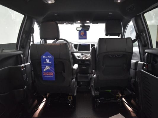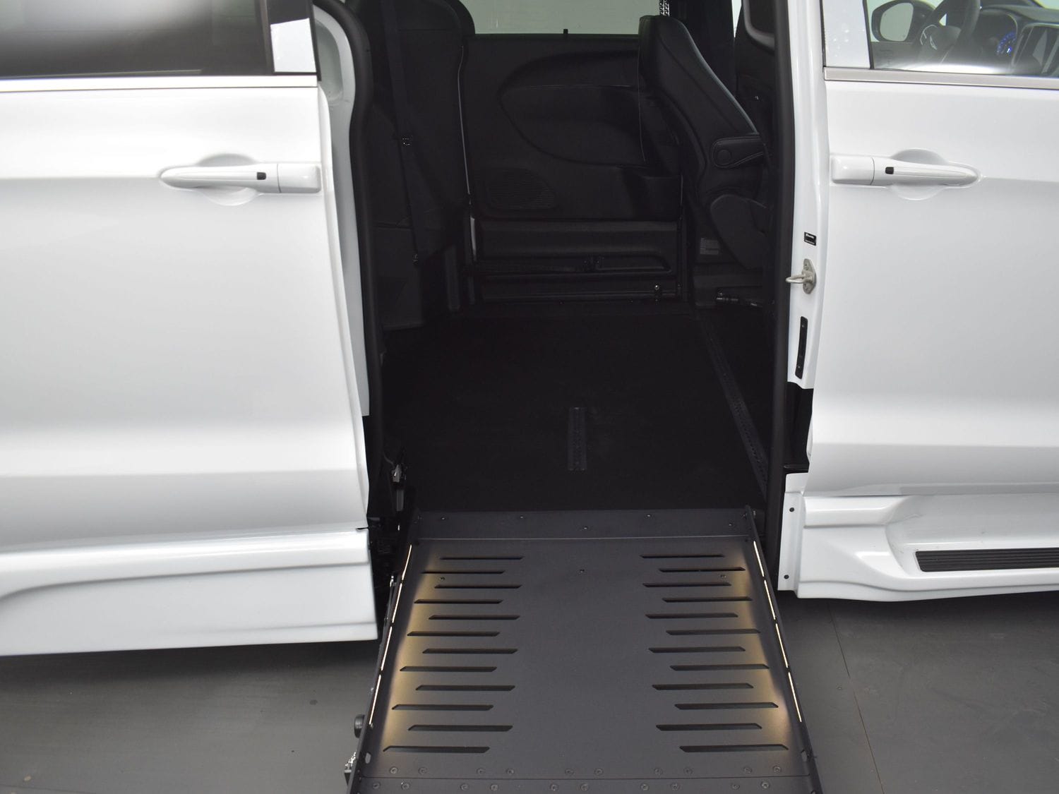 Remote keyless entry system with two transmitters (OEM supplied) for: power passenger sliding door, kneeling system and power folding ramp; (4) interior switches to operate accessible features; 14” lowered floor from rear axle to firewall, 98½” in length and 64” wide at center of floor; 60” floor-to-ceiling height in the center of the van and 60” in driver and front passenger positions; Power passenger side sliding door with manual release feature providing 56.5” clear vertical passage way; Power aluminum non-skid ramp (30 1/8” wide x 52” long); 32 3/8” ramp door opening; Integrated step at driver and passenger doors; Wheelchair tracking in co-pilot position in addition to center of van; Q’Straint retractable tiedown belts; Easy-out driver and front passenger seats; Electronic, mechanical kneeling rear suspension; On/off kneeling switch; Out-of-park kneeling override; Rubber flooring throughout lowered floor area.