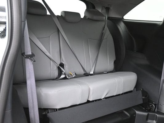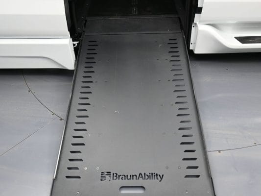 Remote keyless entry system with two transmitters (OEM supplied) for: power passenger sliding door, kneeling system and power infloor ramp; (4) interior switches to operate accessible features; 12” lowered floor from rear axle to firewall, 89 ¼” in length and 59” wide at B pillars; 58 ½” floor-to-ceiling height in the center of the van & 57 ½” in driver and front passenger positions; Power passenger side sliding door with manual release feature providing 54 ¼” clear vertical passage way; Power infloor ramp (30¼” wide x 52” long) with manual backup; One wheelchair restraint belt system; Wheelchair tracking in co-pilot position in addition to center of van; Easy-out driver and front passenger seats; Electronic, mechanical kneeling rear suspension; On/off kneeling switch; Commercial rubber flooring in lowered floor area; Remounted spare tire behind 3rd row bench seat in storage department below floor.