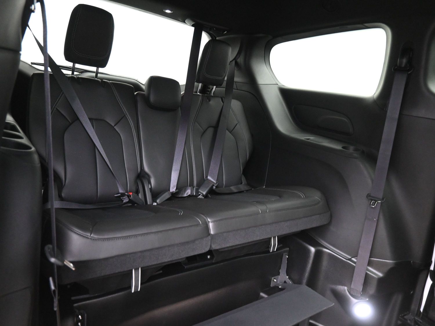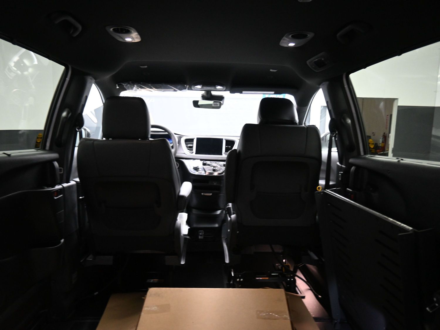 3/8” marine grade plywood sub-floor; Altro commercial flooring; 14” Lowered floor (64” wide x 98.5” long) from firewall to rear axle providing 60” headroom (floor to ceiling) in center of van; Manual folding ramp providing 30” usable width x 52” long; Swingout ramp feature; Manual driver and passenger side sliding doors, with 56”vertical opening and 31” wide opening on passenger side; Quick-release driver and front passenger seats with a wheelchair securement position on passenger side with 60” headroom from floor to ceiling; Multiple wheelchair tiedown locations with one belt securement system; ADA ramp and door entrance lighting; Emergency rear hatch release; Flip down footrests for 3rd row seating. 1 complete set of Q’Straint WC manual restraint belts with lap/shoulder belt.