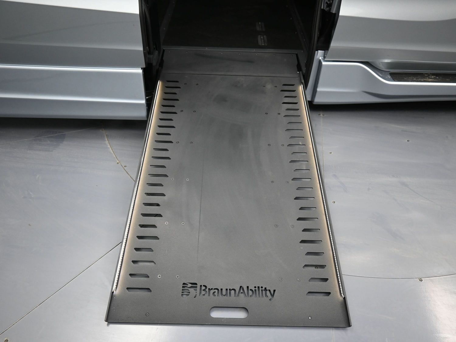 Remote keyless entry system with two transmitters (OEM supplied) for: power passenger sliding door, kneeling system and power infloor ramp; (4) interior switches to operate accessible features; 12” lowered floor from rear axle to firewall, 92.5” in length and 71” wide at center of floor; 59.5” floor-to-ceiling height in the center of the van and 58” in driver and front passenger positions; Power passenger side sliding door with manual release feature providing 54.5” clear vertical passage way; Power infloor ramp (30.25” wide x 52” long) with LED ramp lighting; 30.25” ramp door opening; Integrated step at driver and passenger doors; One wheelchair restraint belt system; Wheelchair tracking in co-pilot position in addition to center of van; Easy-out driver and front passenger seats; Electronic, mechanical kneeling rear suspension; On/off kneeling switch; Out-of-park kneeling override; Commercial flooring throughout lowered floor area; Q’Straint retractable tiedown belts.