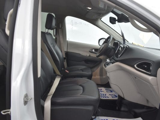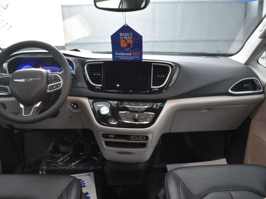 Front wheel drive; 3.6L V6 engine; 9-Speed automatic transmission; 121” wheelbase; 17” aluminum wheels; Full instrumentation with tachometer; 4-wheel antilock braking system; Power windows; 2nd row power windows; Power door locks; Heated power remote mirrors; Fog lights; Tilt/telescoping steering wheel; Heated, Leather-wrapped steering wheel; Steering wheel-mounted audio controls; Remote start; Remote keyless entry; AM-FM radio with USB & AUX inputs for digital media devices; ParkView rear backup camera; UConnect 5 with 10.1” display; Integrated voice command with Bluetooth; Apple Carplay; Sirius Satellite radio option; Remote Start; Push-button start; Front and rear air conditioning and heating, with 3-zone temperature control; Dual front air bags; Supplemental side-curtain air bags; Adaptive Cruise Control; Pedestrian Emergency Braking; Blind spot and rear cross path detection; Lane Departure Warning Plus; Rain sensitive intermittent wipers; Rear window defroster; Rear windshield wiper; Dual sun visors with illuminated mirrors; Overhead rail system; Driver’s & passenger side chrome bumper strips; Universal garage door opener; Reclining front bucket seats; Leather upholstery; 8-way power driver’s seat; Heated front seats; 3-person rear bench seat; Driver and passenger side power sliding doors; Power liftgate; Tinted sunscreen glass.