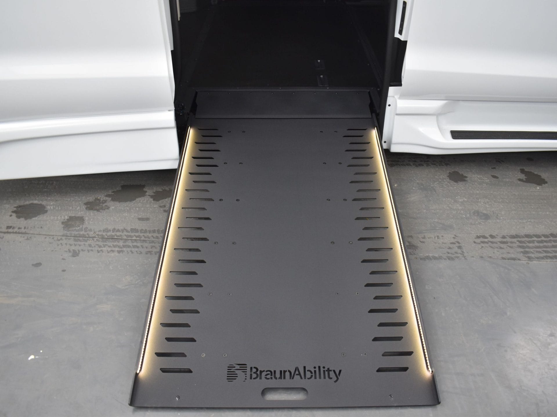 Remote keyless entry system with two transmitters (OEM supplied) for: power passenger sliding door, kneeling system and power infloor ramp; (4) interior switches to operate accessible features; 12” lowered floor from rear axle to firewall, 98” in length and 68” wide at center of floor; 58” floor-to-ceiling height in the center of the van and 58” in driver and front passenger positions; Power passenger side sliding door with manual release feature providing 55” clear vertical passage way; Power infloor ramp (32 ¼” wide x 52” long) with LED ramp lighting; 33” ramp door opening; Integrated step at driver and passenger doors; Wheelchair tracking in co-pilot position in addition to center of van; Q’Straint retractable tiedown belts; Easy-out driver and front passenger seats; Electronic, mechanical kneeling rear suspension; On/off kneeling switch; Out-of-park kneeling override; Commercial flooring throughout lowered floor area.