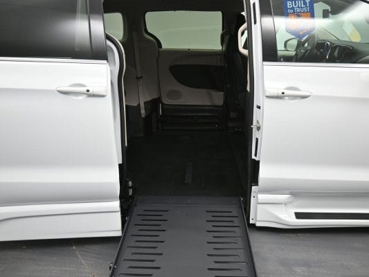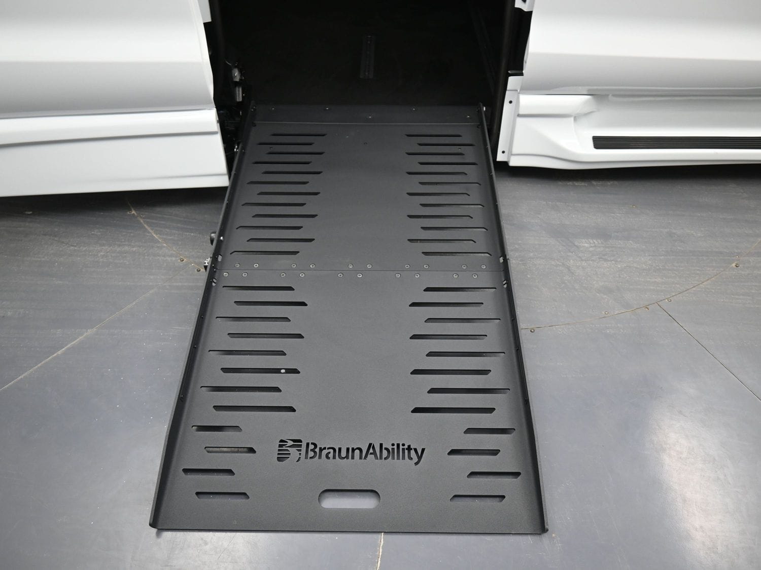 Remote keyless entry system with two transmitters (OEM supplied) for: power passenger sliding door, kneeling system and power folding ramp; (4) interior switches to operate accessible features; 14” lowered floor from rear axle to firewall, 98½” in length and 64” wide at center of floor; 60” floor-to-ceiling height in the center of the van and 60” in driver and front passenger positions; Power passenger side sliding door with manual release feature providing 56.5” clear vertical passage way; Power aluminum non-skid ramp (30 1/8” wide x 52” long); 32 3/8” ramp door opening; Integrated step at driver and passenger doors; Wheelchair tracking in co-pilot position in addition to center of van; Q’Straint retractable tiedown belts; Easy-out driver and front passenger seats; Electronic, mechanical kneeling rear suspension; On/off kneeling switch; Out-of-park kneeling override; Rubber flooring throughout lowered floor area.