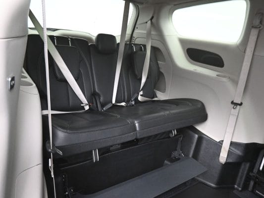 Front wheel drive; 3.6L V6 engine; 9-Speed automatic transmission; 121” wheelbase; 17” aluminum wheels; Full instrumentation with tachometer; 4-wheel antilock braking system; Power windows; 2nd row power windows; Power door locks; Heated power remote mirrors; Fog lights; Tilt/telescoping steering wheel; Heated, Leather-wrapped steering wheel; Steering wheel-mounted audio controls; Remote start; Remote keyless entry; AM-FM radio with USB & AUX inputs for digital media devices; ParkView rear backup camera; UConnect 5 with 10.1” display; Integrated voice command with Bluetooth; Apple Carplay; Sirius Satellite radio option; Remote Start; Push-button start; Front and rear air conditioning and heating, with 3-zone temperature control; Dual front air bags; Supplemental side-curtain air bags; Adaptive Cruise Control; Pedestrian Emergency Braking; Blind spot and rear cross path detection; Lane Departure Warning Plus; Rain sensitive intermittent wipers; Rear window defroster; Rear windshield wiper; Dual sun visors with illuminated mirrors; Overhead rail system; Driver’s & passenger side chrome bumper strips; Universal garage door opener; Reclining front bucket seats; Leather upholstery; 8-way power driver’s seat; Heated front seats; 3-person rear bench seat; Driver and passenger side power sliding doors; Power liftgate; Tinted sunscreen glass.