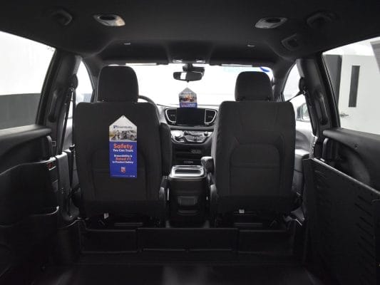 Front wheel drive; 3.6L V6 engine; 9-Speed automatic transmission; 119” wheelbase; 17” Aluminum wheels; Inflatable spare tire kit; Full instrumentation with tachometer; 4-wheel antilock braking system; Power windows; 2nd row power windows; Power door locks; Heated power remote mirrors; Tilt/telescoping steering wheel; Cruise control; Heated steering wheel; Steering wheel-mounted audio controls; Remote keyless entry; Remote start; Push-button start; AM-FM radio with Sirius satellite radio option with USB inputs for digital media devices; Apple CarPlay and Android Auto; ParkView rear backup camera with 10.1-inch touchscreen display; Uconnect 5 with Bluetooth handsfree phone & audio; Adaptive Cruise Control; Pedestrian Emergency Braking; Blind spot and rear cross path detection; ParkSense Rear Park Assist; Full Speed Forward Collision Warning Plus; Lane Departure Warning Plus; Front and rear air conditioning and heating, with 3-zone temperature control; Dual front air bags; Supplemental side-curtain air bags; Rear window defroster; Rear windshield wiper; Dual sun visors with illuminated mirrors; Reclining front bucket seats, with 8-way power driver’s seat; Heated front seats; Cloth upholstery; Driver and passenger side power sliding doors; Power liftgate; Tinted sunscreen glass.